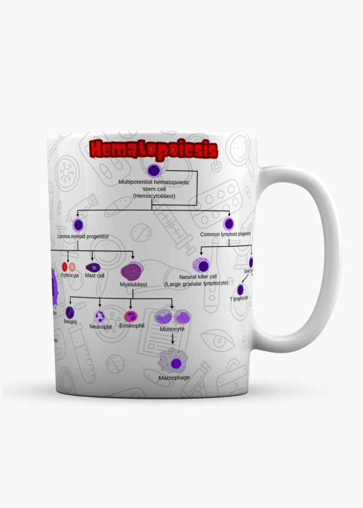 بهذا التصميم الأنيق الذي تم طباعته يدويا ليمثل معلومات طبية مثرية عن عملية تكون الدم بكل جودة ووضوح، هذا الكوب يكمل أي ديكور للمنزل أو المكتب أو أي مكان آخر. كما يمثل هذا الكوب إضافة رائعة كهدية مدروسة لمحبي القهوة والشاي.